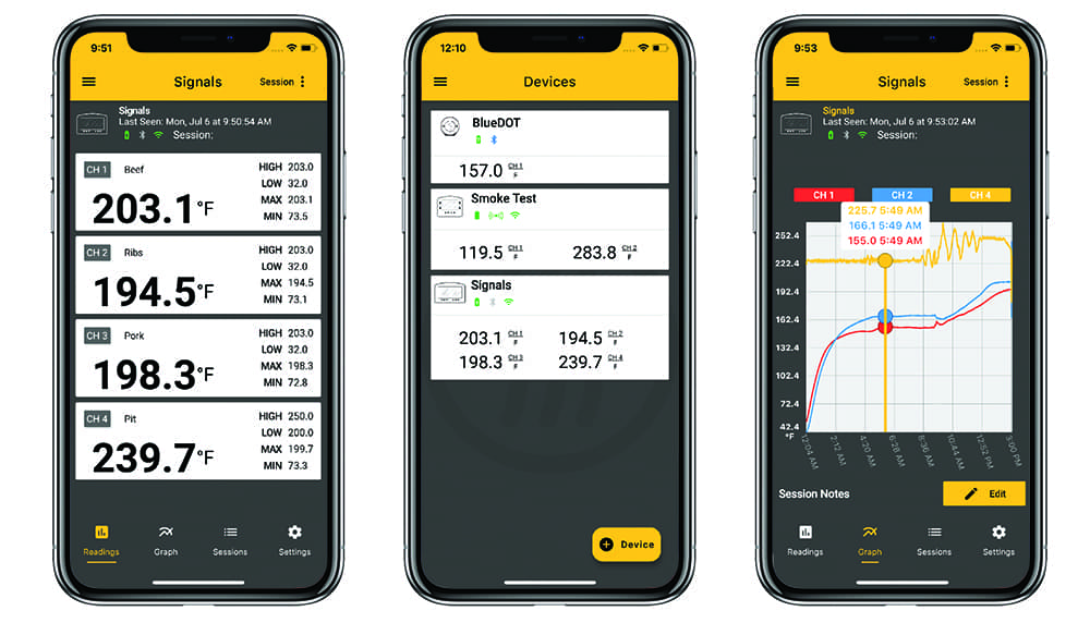 Signals er et 4-kanals alarmtermometer der fungerer med din smartenhed OG som en selvstændig enhed med fysiske knapper (så du ikke behøver at tilsmudse din smartphone). Signaler leveres med både Bluetooth™ og Wi-Fi indbygget og skifter problemfrit mellem de to så du får et kontinuerligt signal og realtidsadvarsler uanset om du er i marken eller på tværs af byen.