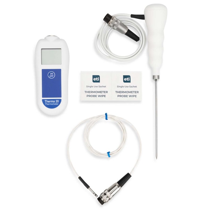 Therma 20 er et professionelt catering-termometer kit som leveres i en praktisk ABS-taske, inkl. 2 stk. måleprober, en temperaturlogbog, 100 stk. antibakterielle spritklude og et sporbart kalibreringscertifikat.